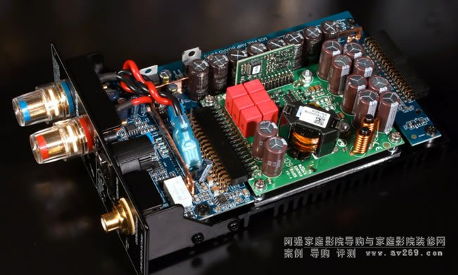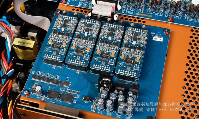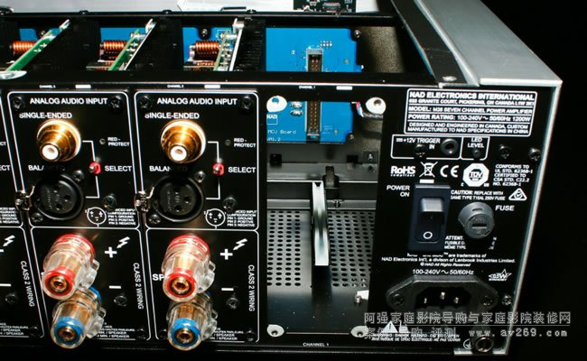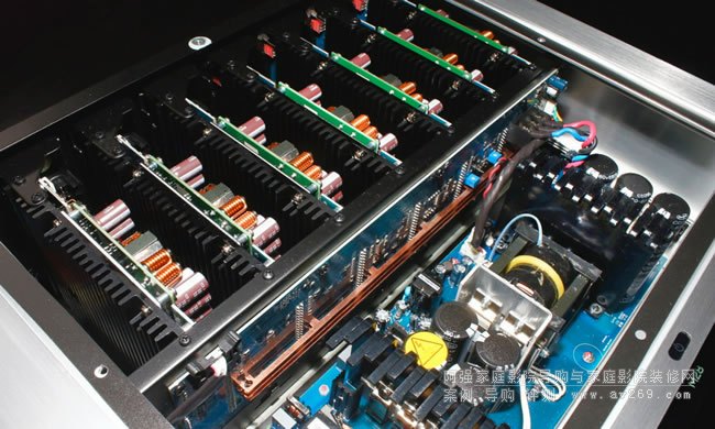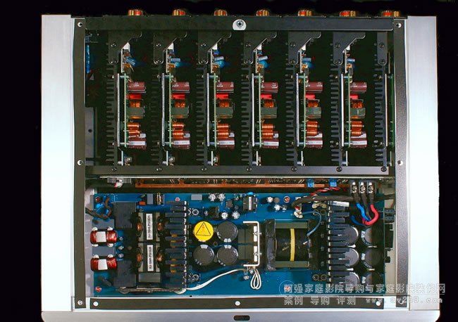 移去上蓋的NAD M28七聲道后級,可以看到機箱內前半部為電源供應處理,后半部則有七個聲道的功率放大模組插槽。