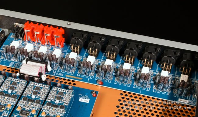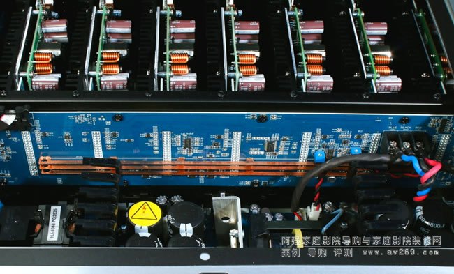 七個功率放大模組插槽的供電,并非透過電路板薄薄的銅箔或細細的電線傳輸,而是由左至右橫跨電路板上方平行的三片銅金屬板,確保所需的大電流能夠順暢流通傳遞。