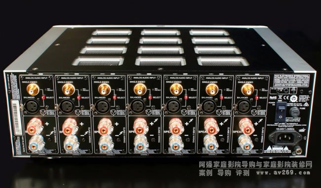 七聲道后級M28的背板相當簡潔整齊,由左至右就是七個聲道的放大模組,上半部為音訊輸入、下半部為喇叭輸出端子。