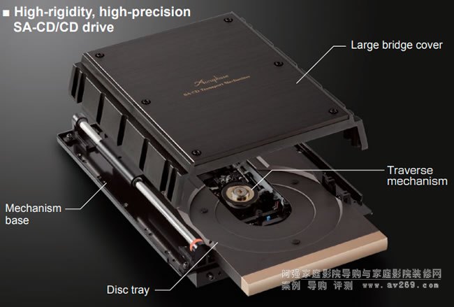 高分子SA-CD/CD驅動器安裝在三層底板上具有出色的振動降低特性,全部支持高碳鑄鐵絕緣子。這種配置創造了一個強大的抑制外部振動效果的集成結構關于遍歷機制。四個新開發的高質量丁基“彈性阻尼器”連接遍歷和圓盤機制,急劇連接將外部振動從傳播到遍歷機制并保護讀取光盤的鏡頭執行器。音樂由于這些振動保護,可以準確讀取信息技術然后發送到數字處理器。