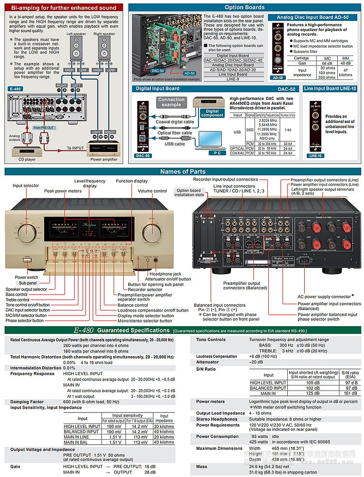 金嗓子Accuphase E-480立體聲兩聲道功放,前置放大器部分采用 AAVA 音量控制的最新實現,可進一步提高清晰度。功率放大級的儀表放大器原理可實現完全平衡的信號傳輸,并實現一流的信噪比。平衡遙感可實現輸出電路的低阻抗,從而產生600的阻尼系數。功率放大級使用三并聯推挽配置的功率MOS-FET,為8歐姆提供180瓦的功率,提供動態音樂享受。