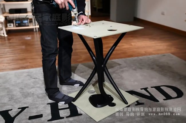 回到KAYA S12的使用上,這對音箱有原廠腳架可以選購,坦白說腳架并不便宜,臺灣代理商定價為6萬1千元,但這對腳架相當漂亮,市面上大概也買不到類似的,在腳架乘載面上有三個螺絲孔,可以與KAYA S12底部相鎖保持音箱本身的安全。
