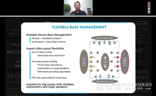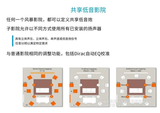 專家級低音管理,與手動校準一起使用,帶來了添加多達六個獨立低音區的能力,這讓你可以將低音炮匹配到揚聲器組。例如,來自LCR聲道的低音和LFE可以被映射到房間前面的低音炮,來自側面揚聲器的低音和LFE被引導到房間兩側的低音炮,以此類推。它還為集成商和校準者提供了將專用的超低音揚聲器指定為LFE通道的選擇。