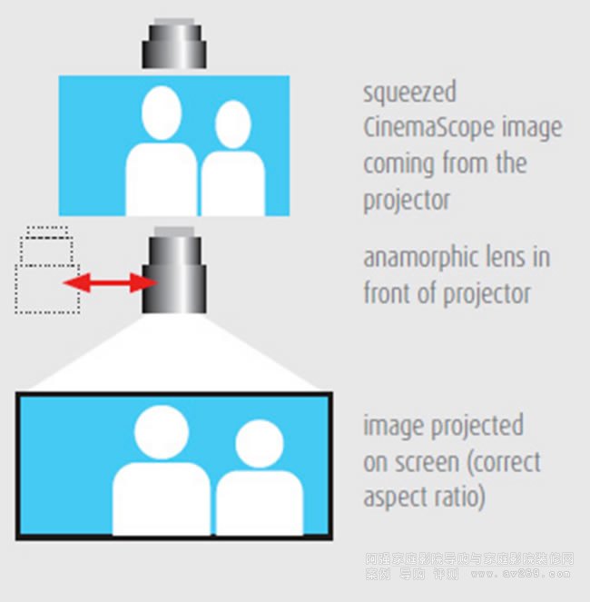 投影機投射出經(jīng)過擠壓的圖像,變形鏡頭的作用是把通過它的光束橫向拉升33%左右,把被擠壓的圖像拉升到正常的比例,同時畫面寬高比從16:9拓展到2.35:1,實現(xiàn)寬熒幕的效果。