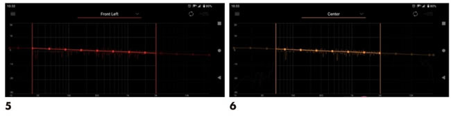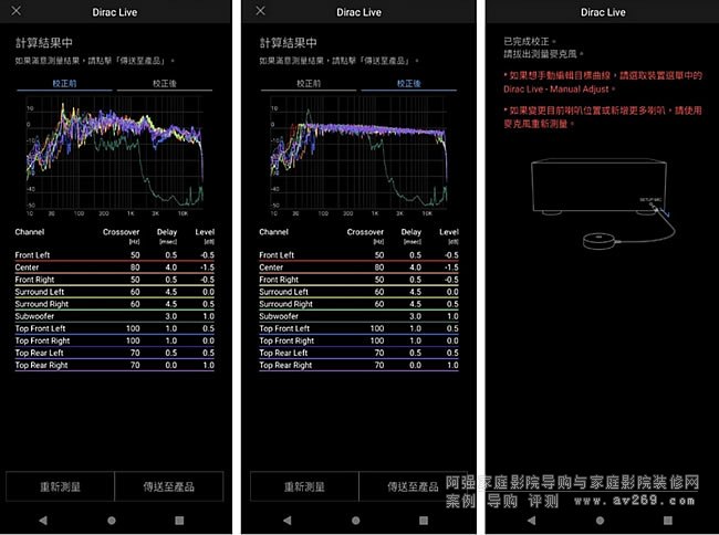 隨即依照頁面指示變換麥克風的測試位置(圖3),在所有位置都測試完畢之后,您可以看到“校正前”各聲道喇叭發聲在聆聽位置的頻率響應狀態(圖4),“校正后”的狀況請見圖5,包括超低音聲道在內,所有聲道的頻率響應都會被Dirac Live校正到非常平坦的程度,最后請記得點選“傳送至產品”,隨后看見圖6的畫面,此時才能確定已經把Dirac校正的計算結果交給TX-NR7100,這樣就完成整個測試程序,可以拔下麥克風了。