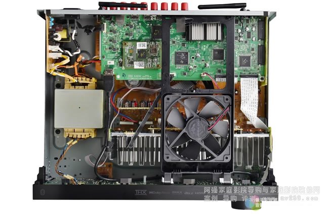 接下來為您解說TX-NR7100的機內結構,我整個觀察記錄下來,我覺得它根本就是“TX-RZ50的平價版”。NR7100與RZ50兩者數位主板的相似度高達九成以上:使用TI Aureus TMS320DA808(D808K013DPTP5)與Cirrus Logic CS49844A兩枚DSP晶片做數位音訊處理,在數類轉換電路部分主要的7.1聲道使用TI PCM1690 32位元8聲道DAC(動態范圍113 dB)、次要聲道則用TI PCM5101A(動態范圍106 dB),在DAC晶片之后應用Onkyo獨家的VLSC技術徹底去化數位脈衝噪訊,小信號放大使用的主要元件是低噪音的JRC NJM4580雙OP Amp晶片。