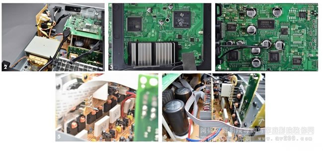 TX-NR7100的功放電路是採取簡潔結構、低負回授的設計,每聲道使用一對有寬頻特性的功率晶體2SA1962A/2SC5242A推挽輸出(圖5),功放電路的電源使用兩枚10,000μF濾波電容,電容的位置與前方三聲道輸出級功率晶體很靠近(圖6),這是為了縮短供電路徑、降低輸出阻抗。