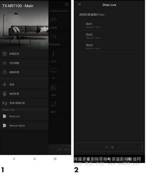 即使不用電腦,TX-NR7100仍可透過“Onkyo Controller App”進行進階設定,我在內文中有提到用家可以自訂頻率響應的校正范圍,請見圖1的頁面,選擇最下面的Manual Adjust進行Dirac手動設定,接著選要編輯的Slot,我建議讓Slot1保留原本的測試校正狀態,進行手動調整我就用Slot2(圖2)。