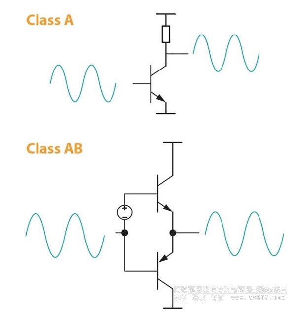 AB類是B類的改良,它是把B類推挽輸出級功率晶體的工作點從零稍稍往上拉,以解決交越失真的問題,由于工作點介于B類與A類之間所以稱為AB類,因此一般的AB類在“微小功率輸出”的狀態下可說是採取A類工作,但是因為很多玩家知道A類好聽,在1980年代就有“Quarter A”、也就是刻意把AB類功率晶體的Bias拉高、提高靜態電流,讓AB類功放擴張A類工作范圍的設計,使AB類擴大機額定功率的1/4處于A類工作,例如80瓦Quarter A擴大機在20瓦以下的輸出狀態等同于A類放大。