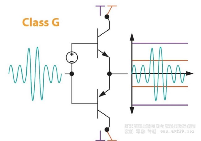 請見上圖,這是G類簡單的工作原理:所有的AB類與A類放大的輸出級只有一組電源供應,供應的直流電壓是固定的,功放電路輸出功率愈高、供電電壓愈高,但中小功率輸出狀態下供電電壓與輸出音訊電壓相差愈大、效率就會愈低。