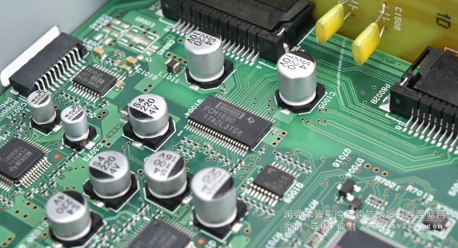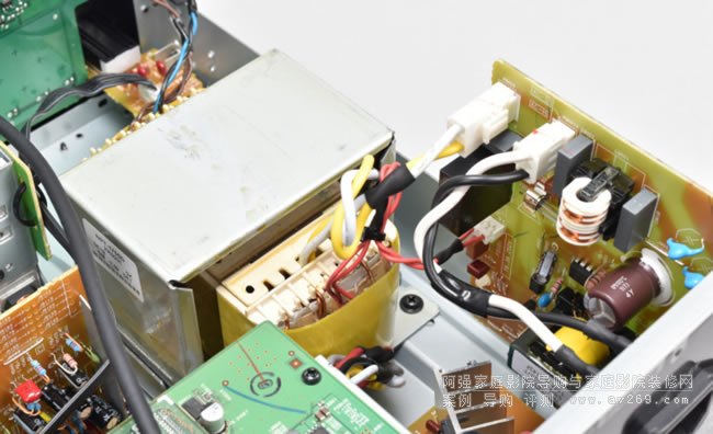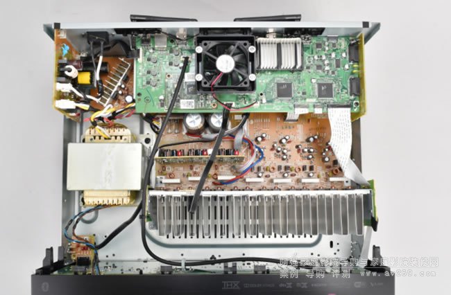 再看到本機(jī)的電路配置,打開(kāi)機(jī)箱會(huì)發(fā)現(xiàn)TX-NR6100採(cǎi)取一貫的“電源分離”設(shè)計(jì),左側(cè)有一顆體積頗大的EI變壓器,它負(fù)責(zé)的是聲頻電路的電源,同時(shí)旁邊還有一組交換式電源則負(fù)責(zé)數(shù)位電路供電。