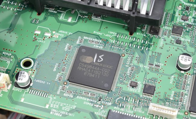 環(huán)繞解碼前級(jí)部分,最上層是數(shù)位電路主板,可以看到它採(cǎi)用一只Cirrus Logic CS49844A DSP晶片,負(fù)責(zé)數(shù)位音訊處理和AccuEQ自動(dòng)測(cè)試等功能。再來(lái),數(shù)類轉(zhuǎn)換電路主要聲道用32bit 8聲道DAC晶片TI PCM1690、次要聲道用兩枚二聲道DAC PCM5101A做解碼,在DAC晶片之后,小信號(hào)放大使用的主要元件是低噪音雙OP Amp JRC NJM4580。