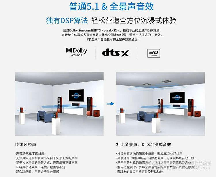 HD-3080支持Dolby Atmos和DTS:X沉浸式音效,并向下兼容所有Dolby、DTS音頻格式,將平凡的每個(gè)瞬間轉(zhuǎn)換至驚艷非凡的場(chǎng)景,還可通過(guò)Dolby Surround和DTS Neural:X技術(shù)優(yōu)化非全景聲聲源,輕松營(yíng)造沉浸式3D音效。