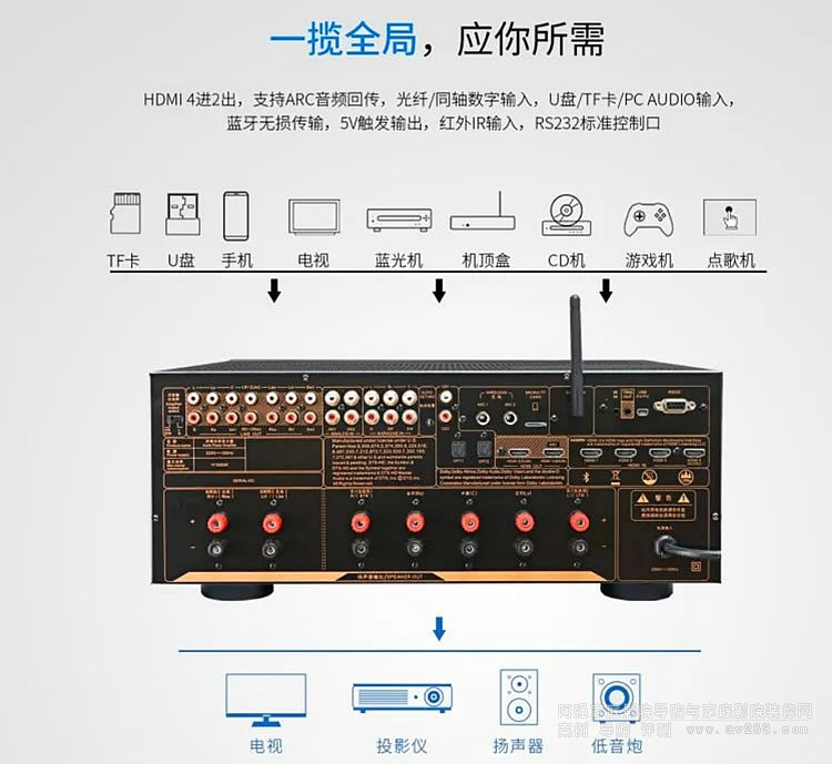 它配備HDMI4進(jìn)2出的HDMI2.0接口,其中一組支持ARC音頻回傳;接口豐富,滿足高品質(zhì)家庭客廳所需,只需一根高品質(zhì)HDMI線連接即可享受家庭私影氛圍;