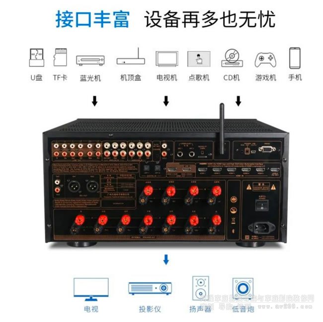 此外,HD-3000A配備了6組HDMI輸入,2組HDMI輸出,支持HDMI ARC音頻回傳;支持藍(lán)牙、RS232、3.5mm觸發(fā)接口和IR操控接口齊備,并支持TF卡和U盤播放。兼具光纖、同軸、模擬輸入,接口豐富,排布整齊。