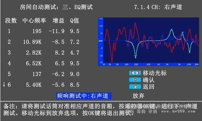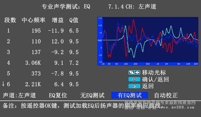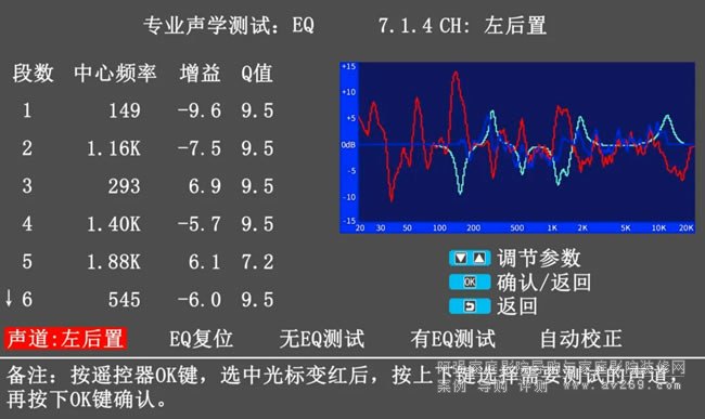 操作時,接入T-2測試話筒后打開菜單選擇EQ調(diào)節(jié),即可根據(jù)實際聽音環(huán)境進(jìn)行多維度測量,每聲道多段EQ校正,使用簡單,全程可視化操作。經(jīng)過專業(yè)高效、精確穩(wěn)定的房間聲學(xué)處理后,影音設(shè)備的聲音效果可以再提升一個檔次。