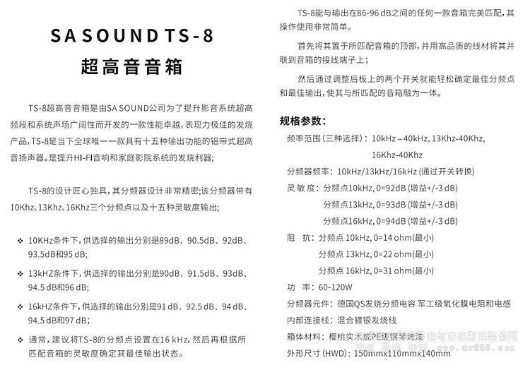 SA SOUDN TS-8鋁帶式高音音箱 是SA 公司對了提升影音系統(tǒng)超高頻段的延伸度會更好和聲場更開闊的一款卓越超音音箱