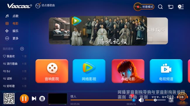 騰訊視頻,音響影院,4K全景聲影片自動推送,正版影庫,云端推送。讓您暢享海量正版超高清電影,每周推送最新電影,在家中享受影院級效果。