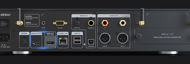 兩個HDMI信號輸出接口,可以實現“音畫分離”,基本操作并不新鮮,不過讓我感到好奇的是副口還可以支持多聲道DSD Native輸出。目前我還沒見過這種操作的硬盤播放機,也不太理解NEO α(Alpha)的用意,對內置解碼器不自信?都ESS9038Pro了還想怎樣;考慮未來技術升級換代?也許吧。