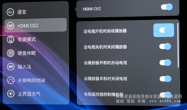 不大適應的是NEO α(Alpha)配的這個V10 Mini小遙控器沒有紅外學習功能,遙控其它設備不太方便,調整下音量還要換著遙控器操作。不過后來才發現,設計師早就考慮到這個問題了,其它設置里有個HDMI CEC,打開同步開關機功能和播放器控制AVR音量,問題迎刃而解,而且更方便了。
