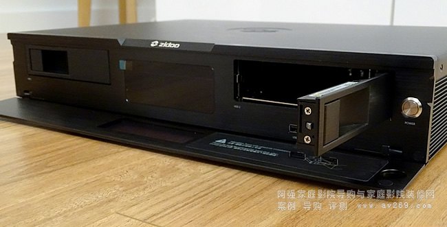 Zidoo在構(gòu)建質(zhì)量和外觀方面讓人想起晚期的OPPO UDP-203,它具有極簡主義的界面。它的外觀很好,也具有很多的功能 - 前鋁面板打開以顯示一個電源按鈕,兩個USB 2.0輸入和雙硬盤驅(qū)動器托架,每個托架都支持高達(dá)16TB容量的HDD。