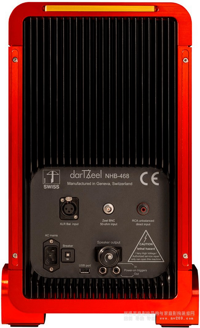 NHB-468內部的元件雖然不多,但都是精挑細選、從功率輸出到喇叭端子的連線采用純銀裸線。機箱是在瑞士日內瓦制造,線路板、組裝也都是在瑞士日內瓦darTZeel工廠內完成,可說是百分百瑞士制造。對了,NHB-468是單聲道機,有沒有分左右聲道呢?單聲道機當然不必分左右聲道,不過為了讓用家使用方便,NHB-468的背板上RCA端子有分紅白,紅色RCA端子那部是右聲道,白色RCA那部是左聲道。還有,NHB-468的電源插座旁并沒有保險絲,而是以無熔絲開關取代,如果保險開關跳開,只要故障排除,再Reset就可以。
