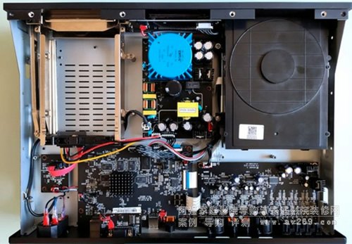 ▼G5800的內部采用了大量的金屬屏蔽罩,以隔絕強弱電、高低頻、數字模擬之間的電磁干擾。去掉屏蔽罩之后,可以看到供電模塊在正中,主板位于下側,硬盤倉在左上角,光碟機在右上角。散熱風路從硬盤倉底部、光碟機底部進風,熱風通過左右側和后部的出風口排出。合理的風道,配合合理的布局,實測散熱效果非常理想。