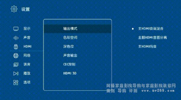 ▼主HDMI音畫混合、主副HDMI分離、主HDMI純音、RGB全色彩空間、12位色深: