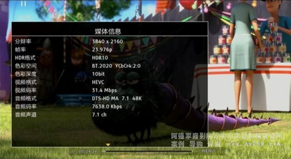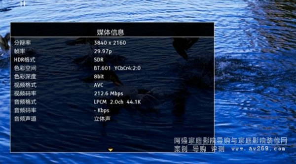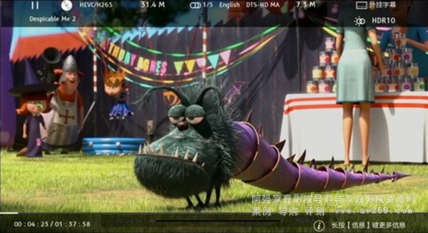 ▼這種細節還體現在影片信息的顯示方面,按下信息鍵,影片信息將以半透明的形式出現在畫面的上下部分。常用信息,包括影片格式、畫面碼率、聲音軌道、聲音碼率、字幕、HDR、當前進度等都可以一覽無余。