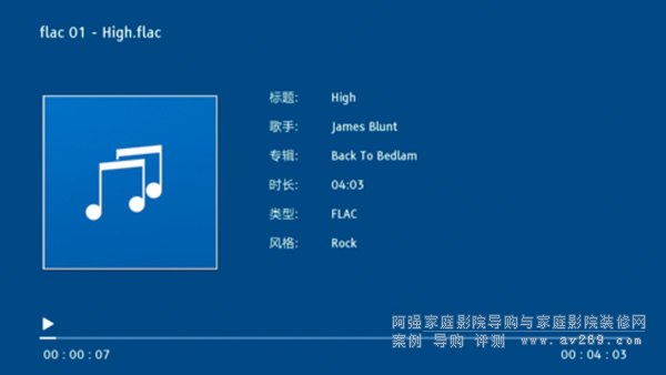▼經過逐個測試,證實了G5800的硬盤媒體兼容度還是很高的。視頻支持avi、dat、flv、m2ts、mkv、mov、mp4、mpg、tp、trp、ts、wma、H.265、HEVC等格式。音頻支持amr、ape、flac、m4a、m4r、mp2、mp3、wav、wma、DSD(64/128)等格式。限于篇幅就不逐個截圖了,選個flac無損音頻作為代表。