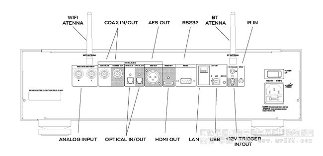 USB 2.0設備(B型)存儲(數字音樂庫)前置和后置USB 2.0 Type A,可通過U盤、硬盤進行播放。紅外線輸入12V觸發器在