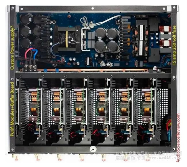 供電部分是開關電源,它被置于另一個空間里面,由于要同時供給7個功放,這塊開關電源的功率很大,所以電路板的面積占據了底板的一半。通過電源部分的保險絲可以看到,它的規格是15A/250V。可就是說,能提供給功放的最大功率是3750W。