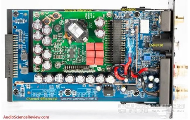 M28每聲道的功放模塊電路設計的還是很講究,除了喇叭輸出部分通過引線連接到輸出端子外,其余需要連接的部分都使用PCB專用的排針插座來連接,顯得相當整齊。綠色電路板正是1ET400A D類功放,藍色的是NAD設計的緩沖輸入級。在這塊電路板上我們看到了TI LM49720高性能的音頻運放,以及MCP6002通用型運放。整個線路的設計是非常緊湊。