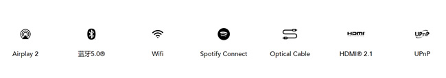HDMI eARC | Optique TOSLINK | AirPlay 2 | Spotfiy Connect | 藍牙 5.0 | UPnP