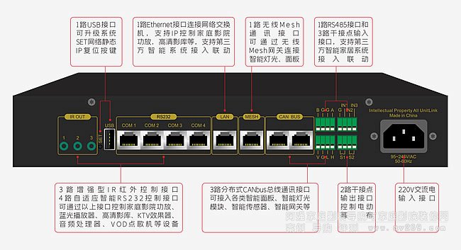 AVSC-AC5200具備1路Ethernet接口、4路自適應(yīng)智能RS232接口、3路增強(qiáng)型IR紅外控制接口,可通過(guò)以上接口控制家庭影院功放、藍(lán)光播放器、高清影庫(kù)、KTV效果器、音頻處理器、VOD點(diǎn)歌機(jī)等設(shè)備。3路分布式CANbus總線通訊接口鏈接各類(lèi)智能面板和智能燈光模塊、智能傳感器等,1路RS485總線通訊接口和3路干接點(diǎn)輸入接口可對(duì)接第三方智能家居系統(tǒng),2路干接點(diǎn)輸出接口可控制電動(dòng)幕布。標(biāo)配2.4G無(wú)指向性藍(lán)牙智能遙控器。AVSC-AC5200配合智能面板、智能遙控器、液晶屏、平板電腦、手機(jī)端用戶端App即可實(shí)現(xiàn)影院、KTV、高爾夫、電視、游戲、會(huì)客等場(chǎng)景的一鍵自動(dòng)開(kāi)啟及各種功能的控制應(yīng)用。AVSC-AC5200集多種先進(jìn)技術(shù)和安全性于一體,極大提升用戶的家庭娛樂(lè)體驗(yàn)。