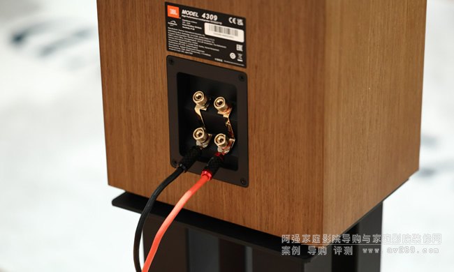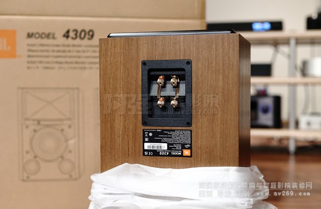 4309的頻率響應為42Hz – 30kHz (-6dB)、效率87dB/2.83V/1m、阻抗4 Ohm、分頻點設在1.6kHz,在號角下方有一個UHF TRIM(Ultra High Frequency)的增益調整鈕(+1.0, +0.5, 0, -0.5, -1.0)。 分音器經過精心設計,包括使用空心電感(Air-Core Inductors)、Cast Wire-Wound Resistors電阻、low-ESR metallized film capacitors金屬薄膜電容等。 4309背面喇叭端子采用Bi-Wiring設計,端子經鍍金處理。 4309的箱體采用厚達3/4“(18mm)的MDF板制成,外觀有胡桃木(搭配深藍色面網)與黑色(搭配黑色面網)兩個版本可選。