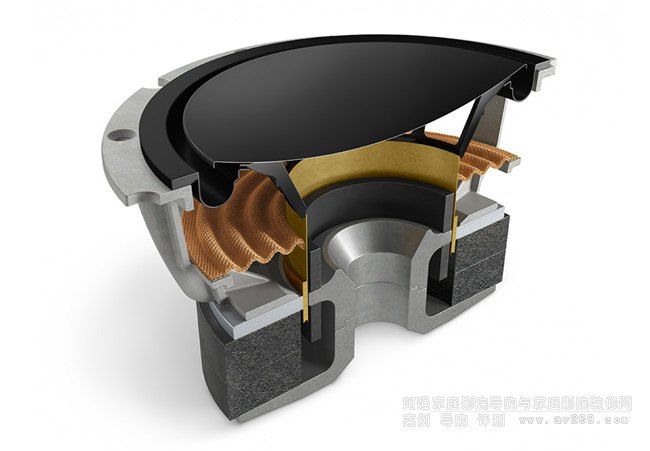 而低音單體采用雙彈波,淺凹盆鋁合金,沒有防塵蓋,一體成形,內凹半圓懸邊。 音圈采用鋁線繞制,音圈筒直徑很大,只比振膜小一點而已,這樣的設計會讓音圈與振膜的一體性提升。
