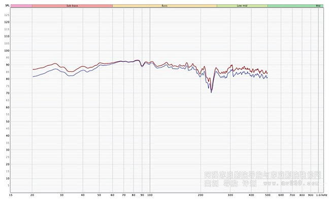 測試信號頻率為20Hz~500Hz,低通濾波功能調(diào)整為直通。其中,藍色部分是“ANECHOIC MK EQ”模式,紅色部分是“THX BASS EQ”模式,“THX BASS EQ”模式主要體現(xiàn)在80Hz往下的頻率,對它作一定程度的增加補償,提高超低頻部分的能量,讓低頻聲音聽起來更深沉