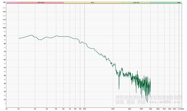 測試信號頻率為20Hz~500Hz,低通濾波功能調(diào)整為“FIXED LOW PASS 80Hz”,EQ模式為“THX BASS EQ”。80Hz以上的頻率被快速衰減,主要是用來搭配THX認證的音箱,但這種情況下只能播放音箱的低頻部分,LFE通道還需要一個獨立的低音炮來播放