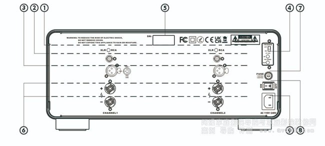 2. RCA 非平衡輸入端口: 具有RCA輸出方式的前極功放,集成功放,CD播放器等音源設備可使用RCA非平衡輸入方式連接E系列純后極功放。