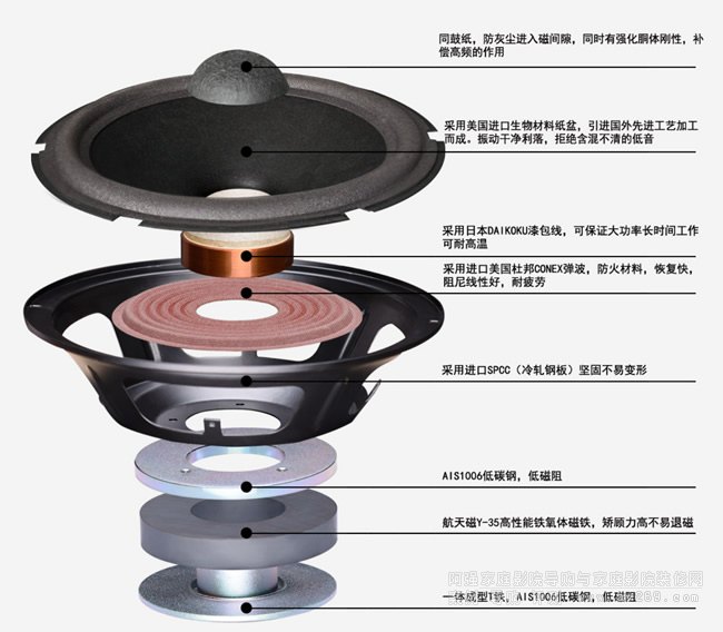 采用航天磁Y-35高性能磁鐵低音單元組成,使低音單元更加沉穩(wěn)有力