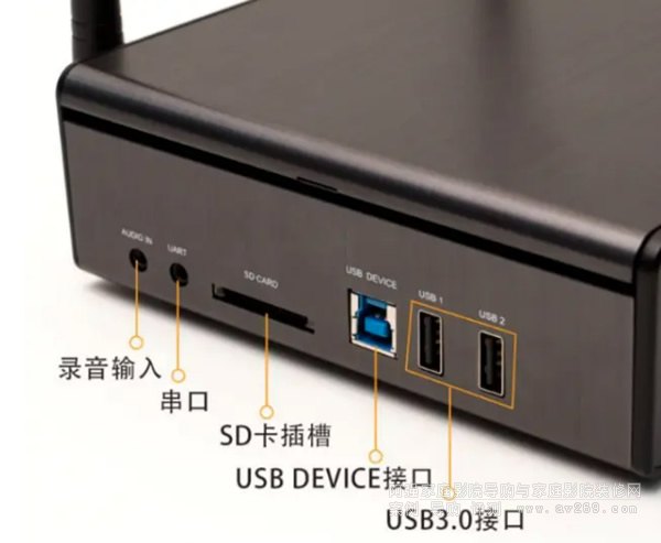 機器側邊滿滿的接口,為不同場景的需求做了錄音輸入(行業僅有),串口RS232接口頭(智能定制安裝的必備),SD卡卡槽擴展讀取照片或者存儲歌曲等需求,USB DEVICE接口(有了他,可以把播放器當硬盤座使用),最右邊有二個USB2.0