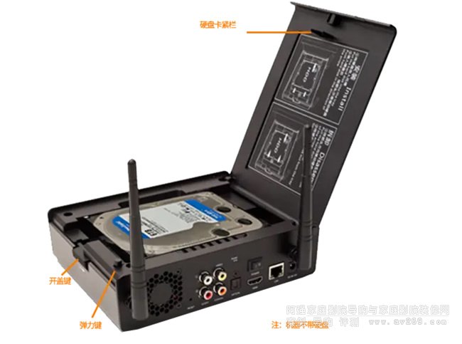 精深的開蓋式設計,內藏乾坤,小身材大容納,結構大有學問,開蓋鍵一鍵輕松彈出上蓋,彈力鍵不但起到打開上蓋作用,更大作用是保持縫隙,讓散熱更通暢,硬盤卡緊欄能讓硬盤更緊而不產生震動以保持播放效果,由于硬盤是快速無釘安裝。