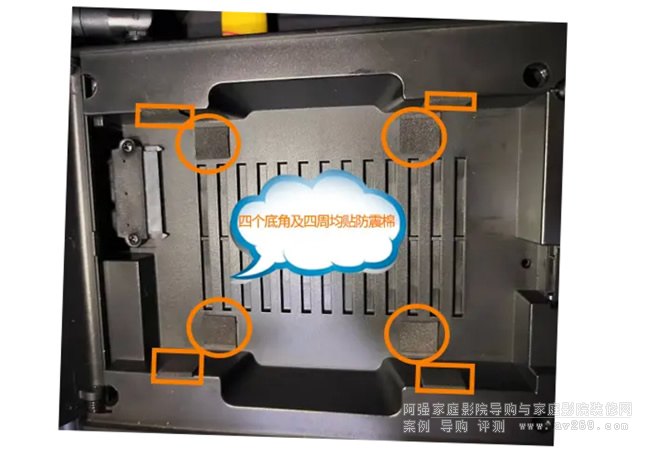 打開硬盤蓋,在沒有硬盤的放硬盤的狀態下,可以清晰看到底部有四塊防震棉,左右也有四塊防震棉,設計周密考慮周到,讓震動降到最低,讓保護升到最高,讓效果達到最佳。值得關注的是從這開蓋圖看,機器線路板與硬盤倉是分開的,這點非常不錯,一來防止相互干憂,二來硬盤的發熱不影響線路板,三按部就班各就各位更整齊,從這可看出,這個機器的安裝難度是非常高。