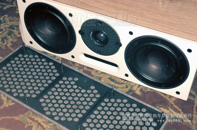 去掉網罩就可以看到超大的29毫米軟球頂高音單元和一對5.25英寸的木纖維音盆。達尼設計的Oberon Vokal 帶有一個凸起的高音單元,這讓我認為梳狀濾波(又名“柵欄”效應)不會成為問題。凸起的高音單元還為下方的膠囊狀前置低音反射端口留出了空間。如果你將中置音箱安裝在帶有封閉式中置音箱架的AV機柜中,那么這個設計應該很合心意。不過我會將Vokal安裝在獨立的書柜上,所以端口的位置并不那么重要。
