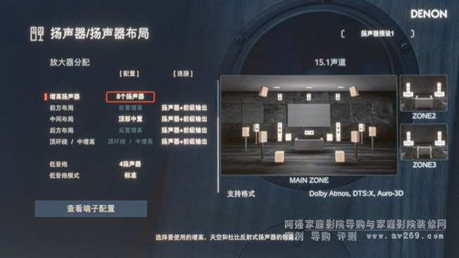 想要最大程度地釋放AVC-A1H的潛能,需要在揚聲器布局選擇15.1聲道布局,在增高揚聲器選擇“8個揚聲器”,在低音炮選擇“4揚聲器”,需要注意的一點,AVC-A1H雖然有17個揚聲器輸出,但實際上會根據Dolby Atmos、DTS:X、Auro 3D的音效不同自動切換相應的系統配置,例如9.4.6 Dolby Atmos與13.1 Auro 3D,并不會所有都出聲