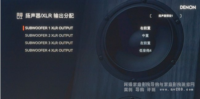 有意思的是,4路超低音輸出均可自定義,比如說分配給前置左右中三路輸出
