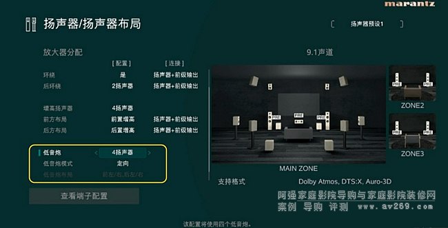 在低音炮模式里面選擇“定向”模式,4只低音音箱就會根據所在區域來播放對應聲道的低音信息