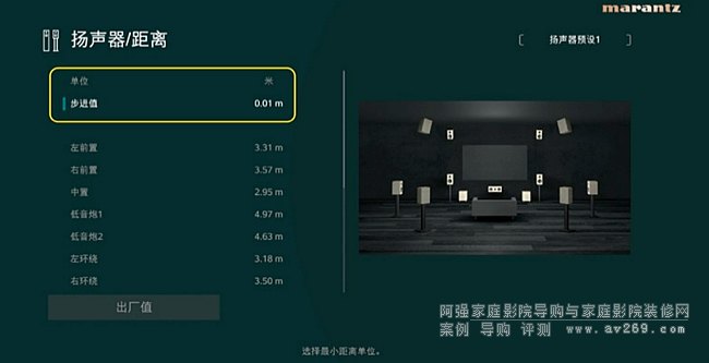 揚聲器距離設置頁面里,步進值有0.1m和0.01m兩種精度可選。當你使用純手動模式設置時,你可以更精確地輸入數據,從而提高聲音的播放效果