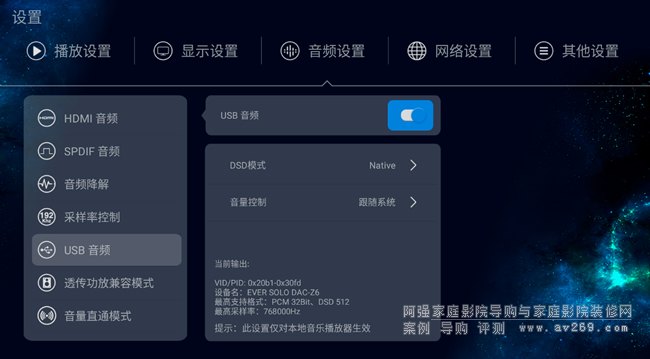 2.3、如未彈出提示,您可以依次進入芝杜設置 - 音頻設置 - 將USB音頻開啟,同時此菜單底部可以查看解碼器參數,到這連接與設置完成
